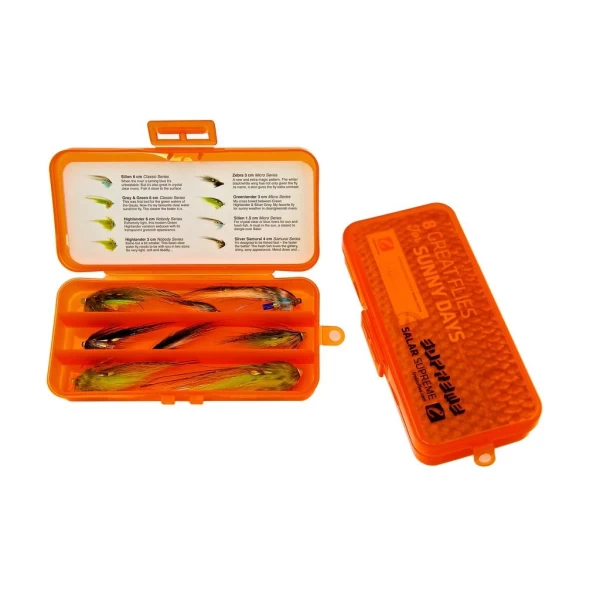 Easily spooked fish and bright days – tricky but not impossible! Here are our favourites in a good mix, presented in our small Samurai SALAR Supreme box.