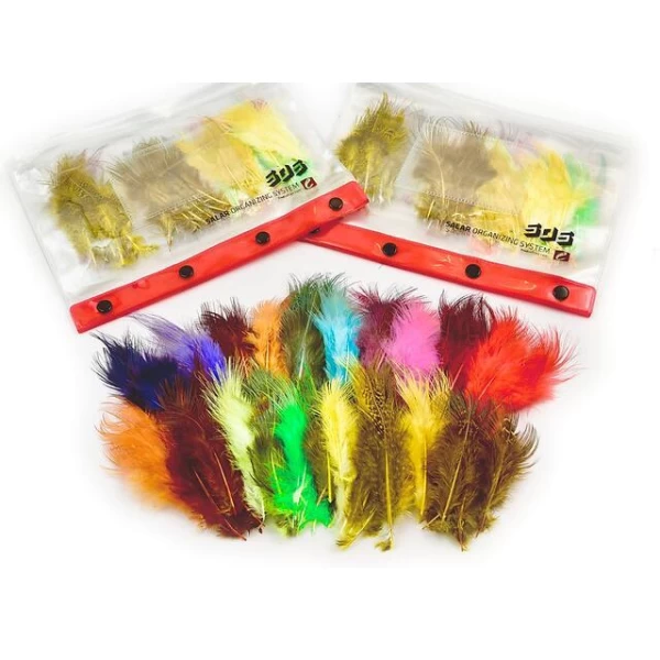The pack consists of 20 colours – 5 feathers of each colour. Deep Purple, Scarlet Red, Light Blue, Chartreuse, Greenlander Green, Hot Magenta, Burnt Orange, Fiery Brown Golden Yellow and Lion colour. All colours dyed natural and Bleached/dyed. A total of 100 feathers, packed in our smallest SOS Organizing Wallet— this gives you a unique collection to hackle almost any fly.