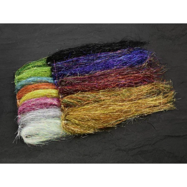 The SSS Flash mixture is consisting of both “Crinkle strands”, “Mirage” and “Mirror strands” and a little bit of HD SSS Angel Hair gives a flash mix that is just completely raw! It doubles just fine, soft and swimming, and how hard I rub it does not tangle! Here you will find the 15 great SSS blends suitable for everything from the lightest to spice up the darkest night fly. The flash is not to stiff but still not to soft to tangle. A flash mix that swim the right way… SSS Flash comes in 15 color blends.