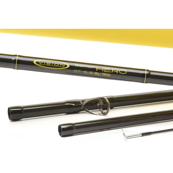 A true high-quality ready-to-go double hand set. The Hero Salmon rod is a 4-piece medium fast action rod with a non-sanded, painted blank. The reel is our modern die cast Hero reel and the line is our Hybrid interchangeable tip flyline with a floating tip and a 15 foot tapered leader. The Hybrid line on the set has been chosen so that it is ridiculously easy to cast. There is 150metres of 30lb backing on the reel so the set covers most salmon fishing situations and if conditions require, you can easily change the tip to a faster sinking one. The set is packed into an easy-to-use protective cordura tube with a reel pouch.