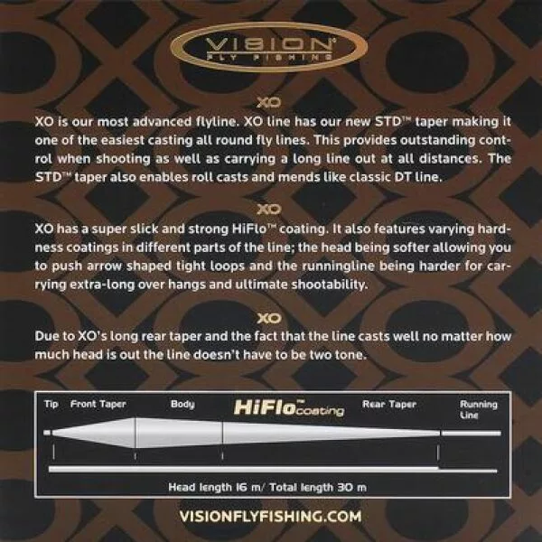 Høytflytende Xo er vår mest avanserte flueline. Den har vår nye STD™ tapering som gjør den til en av de mest lettkastede allround fluelinene. Dette gir deg outstanding kontroll når du skyter ut linen, og også når du drar ut linen uansett lengde. STD™ taperingen gjør det også mulig å roll kaste og oppfører seg som en classisk DT line. Xo har en super glatt og sterk HiFlo™ coating. Den har også varierende hardhet på coatingen på de forskjellige delene av linen.The head er mykere og gir deg muligheten til å presse bue-formede thighte looper og runninglinen er hardere for å bære ekstra lange overheng og ultimat shooting.